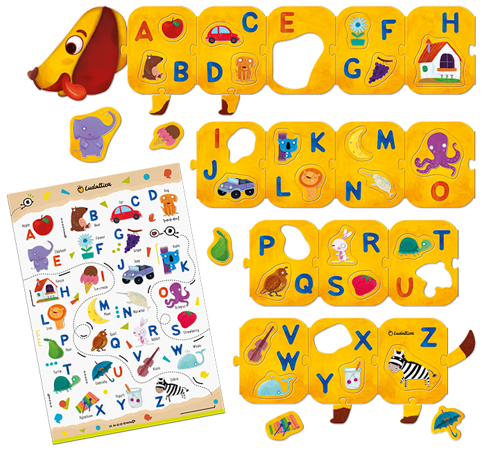 Un juego inspirado por la metodología Montessori mediante el cual los niños y las niñas aprenderán el abecedario y vocabulario en inglés. Para ello, deben formar un largo perro salchicha con las distintas piezas de puzzle e ir encajando en los agujeros los objetos correspondientes a la letra con la empieza cada palafgra. Además, el juego permite formar palabras con las distintas piezas.