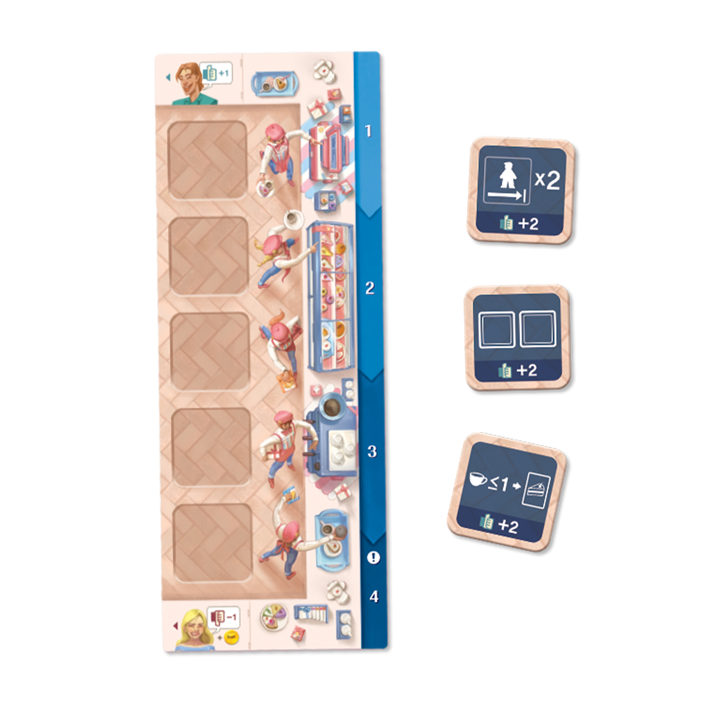Os damos la bienvenida de nuevo. Vuestra cafetería se está expandiendo y las riquísimas bebidas que servís ya no os parecían suficiente, asa que ahora también ofrecéis tartas con las que queréis hacer aún más felices a vuestros clientes. Contratad personal y utilizad sus habilidades para sobrevivir al ajetreo.