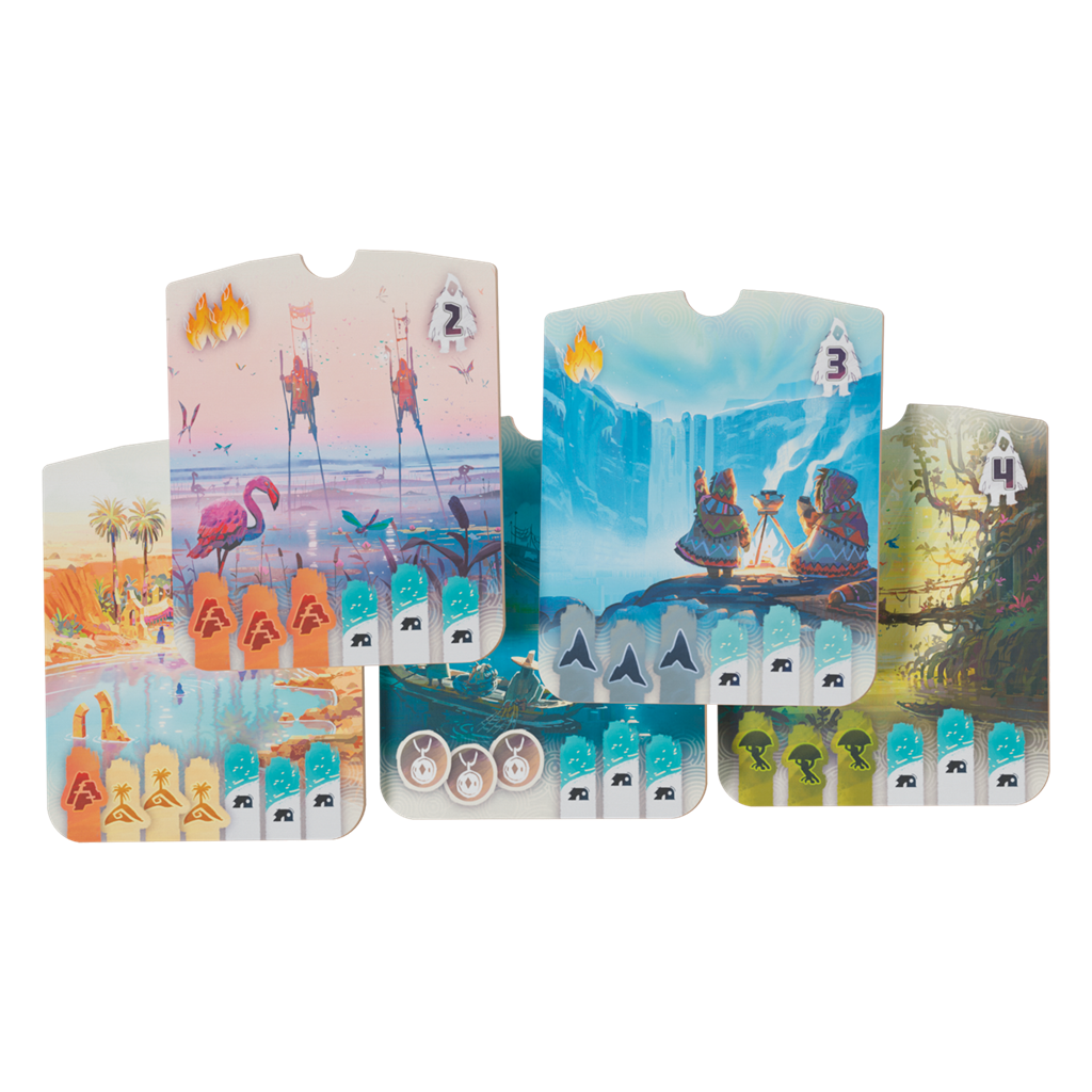 1 marcador de Dewan, 1 cuadernillo de puntuación, 10 piezas de Territorio, 55 cartas de Terreno, 24 piezas de Historia, 5 piezas de Escenario, 15 fichas de Baya, 36 Campamentos (9 de cada color), 4 tableros de Tribu, 1 pieza de territorio de Volcán, 1 pieza de territorio de Diluvio, 20 fichas de Pescado, 8 indicadores de Agua, 8 indicadores de Lava, 1 pieza de Evento