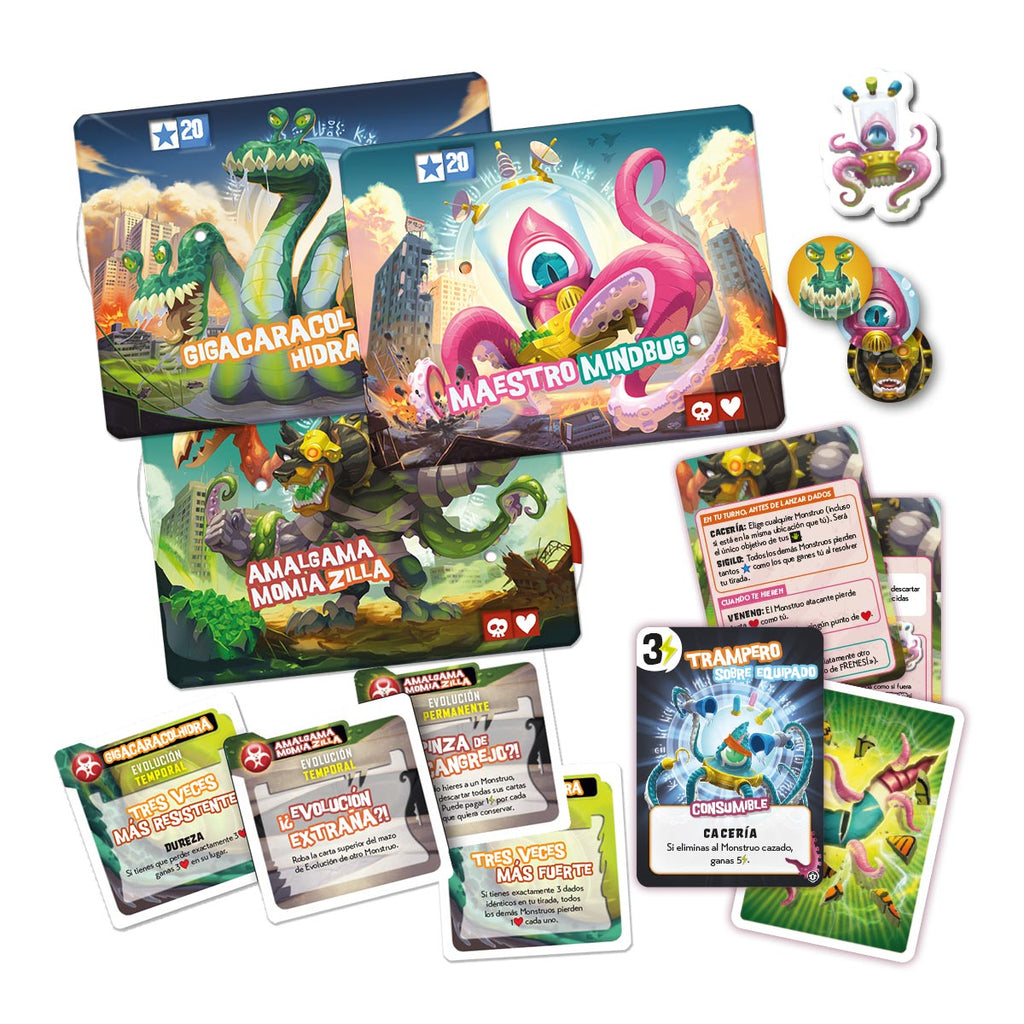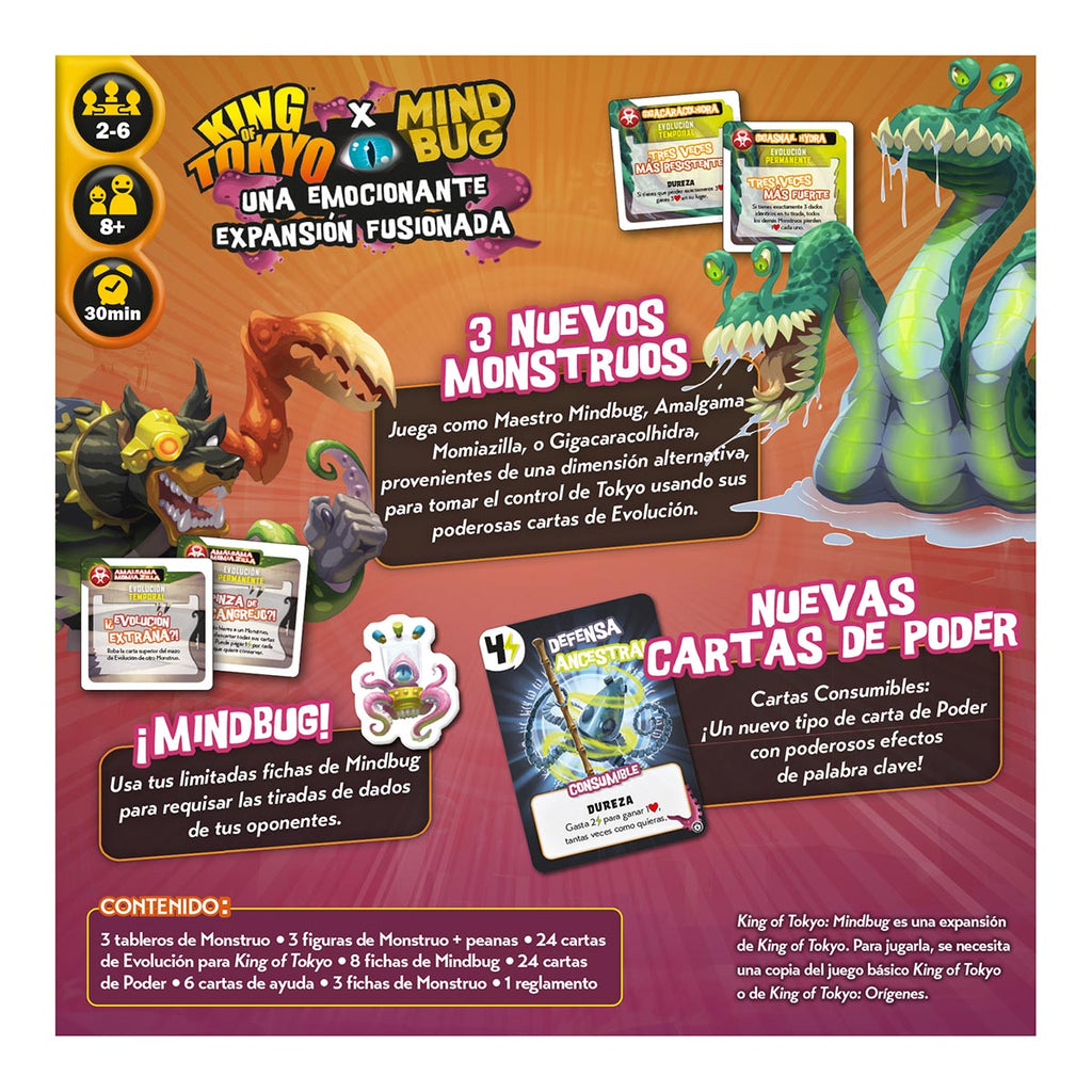 Obra del legendario Richard Garfield (autor de, entre otros juegos, Magic: The Gathering), esta expansión para King of Tokyo añade la mecánica característica de Mindbug que te permite tomar el control de uno de los monstruos de tus rivales en algún momento de la partida. Esta expansión añade 3 nuevos monstruos, nuevas cartas de poder, 24 nuevas cartas de evolución y las fichas de Mindbug.