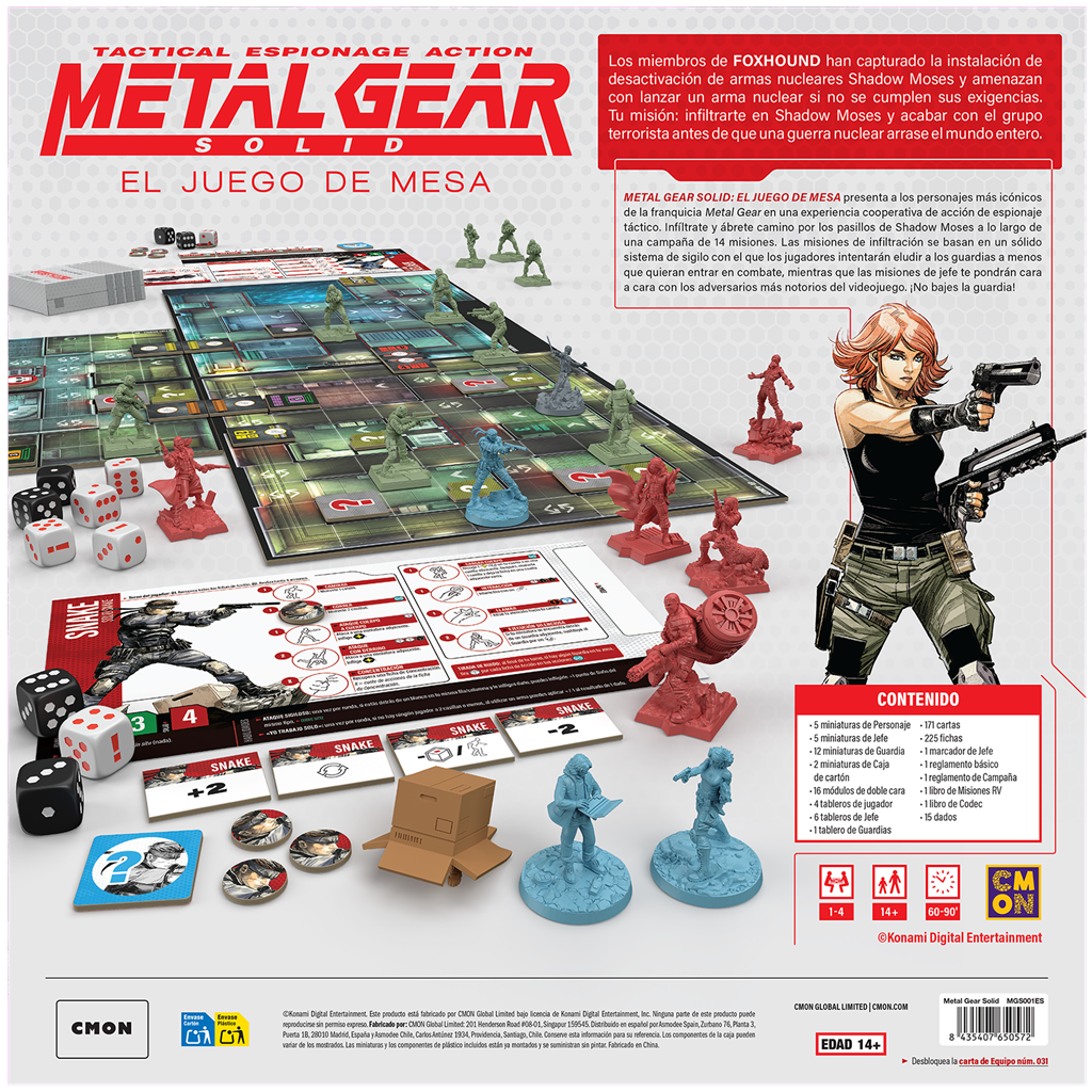 METAL GEAR SOLID: EL JUEGO DE MESA presenta a los personajes más icónicos de la franquicia Metal Gear en una experiencia cooperativa de acción de espionaje táctico. Infíltrate y ábrete camino por los pasillos de Shadow Moses a lo largo de una campaña de 14 misiones. Las misiones de infiltración se basan en un sólido sistema de sigilo con el que los jugadores intentarán eludir a los guardias a menos que quieran entrar en combate, mientras que las misiones de jefe te pondrán cara a cara con los adversarios más notorios del videojuego. ¡No bajes la guardia!